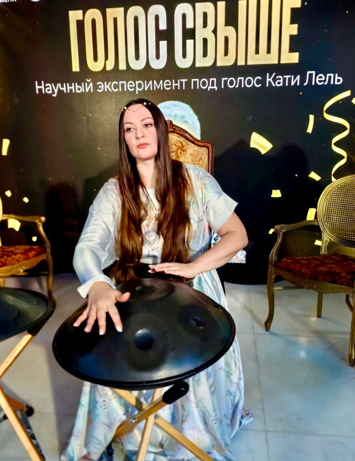 Атмосфера мероприятия была пронизана театральной сказочностью и местами — настоящей фантастикой. За магическое настроение вечера отвечала музыкант Анна Топчиева, которая исполняла чарующие мантры на необычном инструменте — ханге. Его космические и медитативные звуки сразу погрузили гостей в особое состояние.